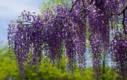 Глициния: кисти этой культуры немного напоминают виноградные грозди, ниспадающие волнами с нежными цветами. Это не совсем цветок, а скорее дерево, которое, зацветая. Занимает центральное место в любом саду.