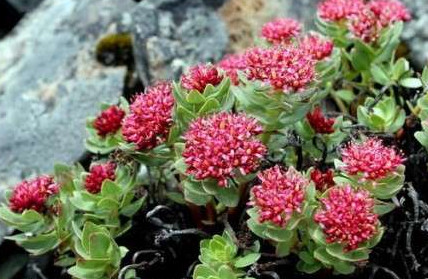 Родиола: отличается листьями большого размера. Наиболее распространен ее розовый сорт. Родиола хорошо цветет в течение июня, июля, но требует обильных поливов.