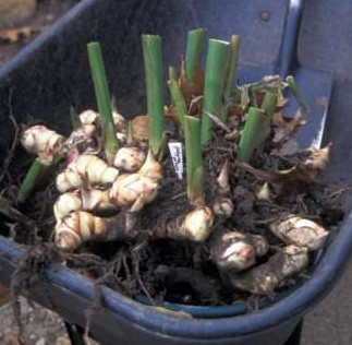 С наступлением первых заморозков листья растений чернеют. Их и стебель нужно обрезать, отставляя небольшую наземную часть, которую сверху можно присыпать перегноем. В конце сентября – начале октября, корневища выкапывают, доставая их вместе с комом земли. Хранить можно в подвале (не ниже +6 градусов), пересыпав песком. Во время хранения песок нужно периодически увлажнять.