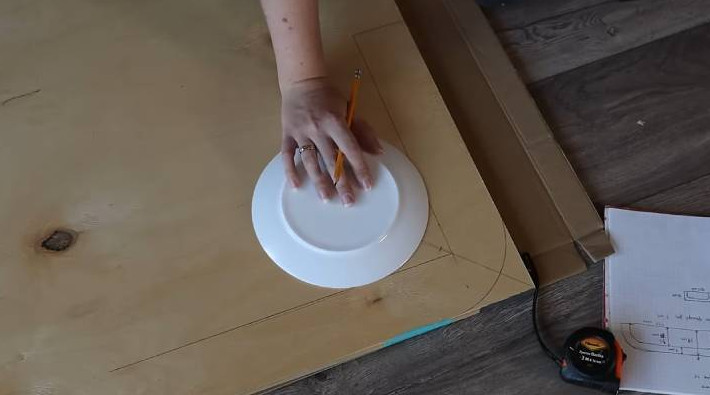 Сделать каркас можно из фанеры 15 мм. Расчертите ножки с закруглёнными внешними и внутренними углами. Размеры банкетки вписываются в фигуру — 124*39 см, ширина — 7 см.
