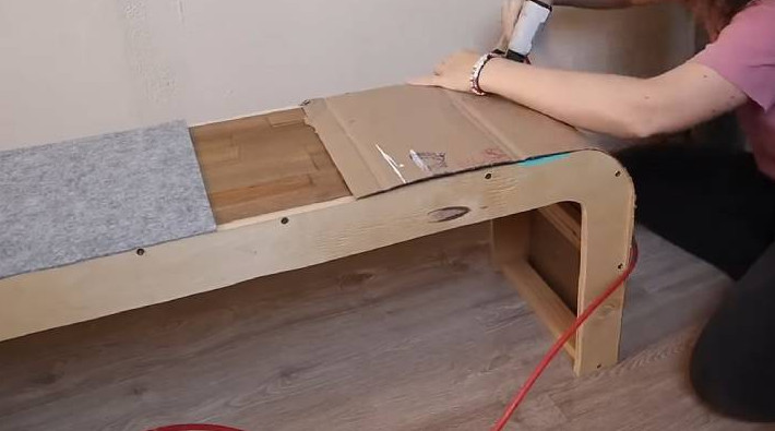 Теперь необходимо подготовить каркас к обшивке. Сначала мебельным степлером закройте банкетку картоном, сверху — фетром или более бюджетным вариантом — ковровым покрытием (можно найти в Леруа Мерлен).