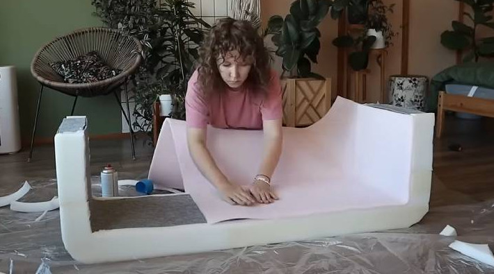 С внутренней стороны закройте банкетку ХДФ, картоном и ковровым покрытием/фетром. Теперь она приобрела объём и при этом осталась лёгкой! Для низа оклейте банкетку поролоном толщиной 10 мм, а для верха — 30 мм.