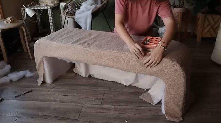 Сверху укройте синтепоном, который сгладит неровности. Наконец, сшейте чехол. Перенесите все детали (боковые, верх и низ) на ткань, вырежьте с припусками 0,5 см, сшейте на машинке, сделайте надсечки в местах закругления, примерьте. Зафиксируйте ткань на внутренней стороне вручную потайным швом, а на дне ножек — мебельным степлером и ручным швом.