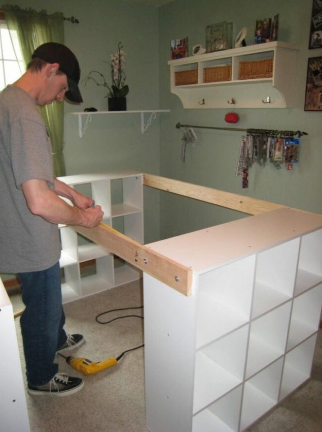 Мебель из IKEA — это бюджетная, практичная и функциональная мебель, которая путем простых переделок превращается в потрясающие вещи для дома. Так, например, три вместительных стеллажа из IKEA легко можно превратить в огромный рабочий стол с большим количеством полок для хранения необходимых мелочей.
