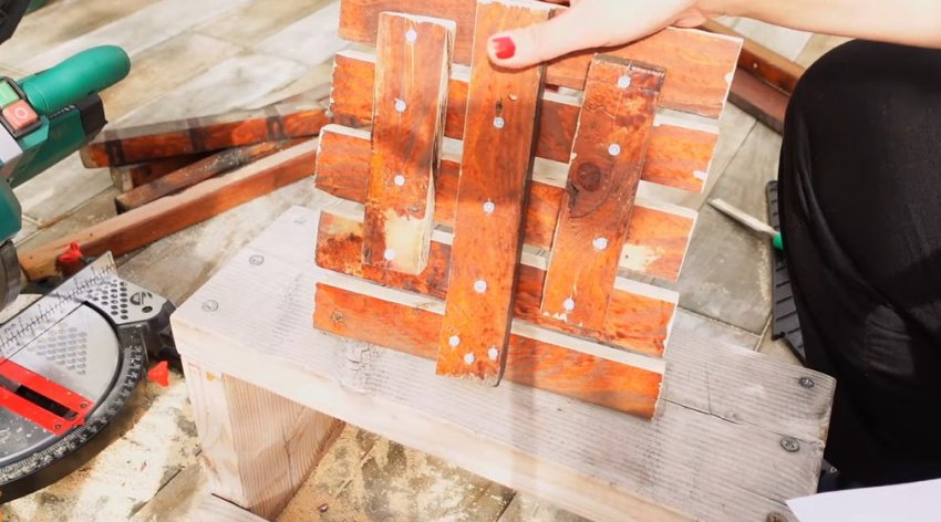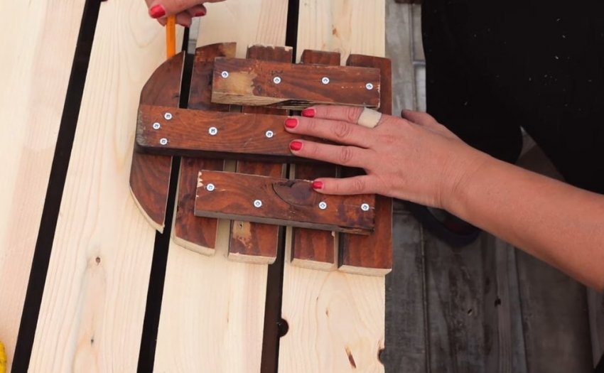 Соедините 5 досок между собой с помощью шестой доски, расположенной перпендикулярно к ним ровно посередине. Для дополнительной фиксации используйте еще две доски меньшего размера.