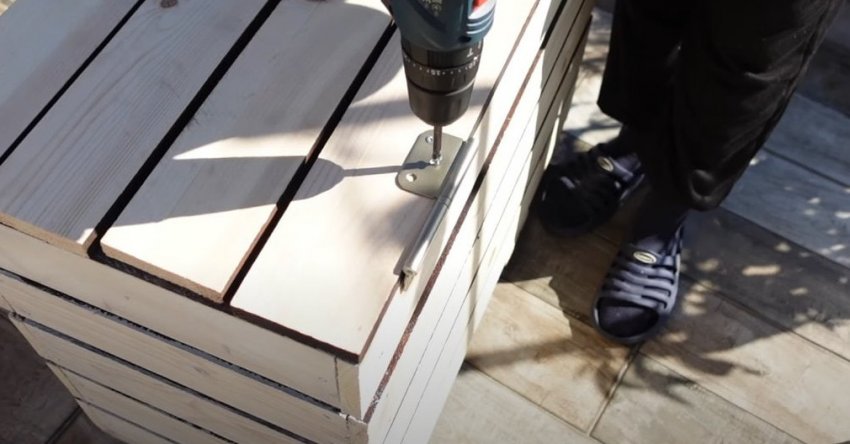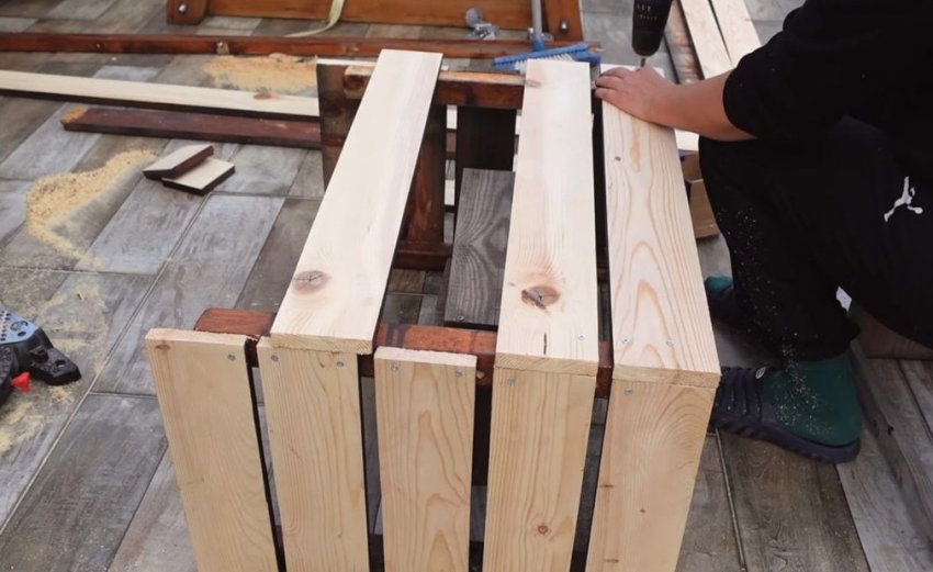 Используя более широкие рейки соберите боковые стенки ящика для овощей. Размер их может быть любым, по вашему желанию. Боковые стенки соедините между собой, сформировав переднюю и заднюю части ящика.
