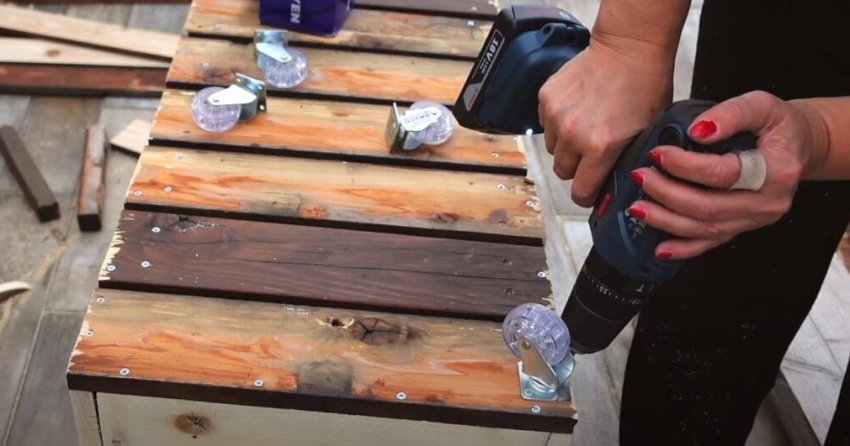 Соберите из досок нижнюю часть ящика и прикрутите к основанию колесики.