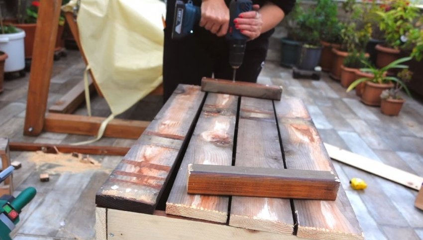 Соберите крышку ящика необходимого размера. К крышке ящика прикрепите две доски для лучшей фиксации.