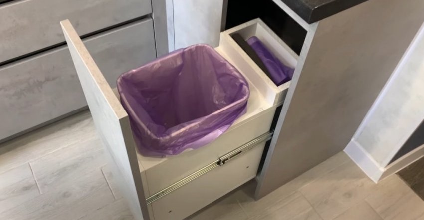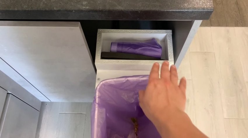 Для дополнительного удобства в верхней части выдвижной системы можно сделать небольшое отделение для хранения пакетов для мусора.