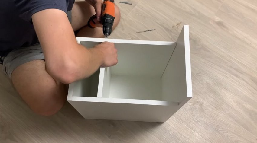 Соедините между собой заднюю стенку, боковые стенки и дно будущей выдвижной конструкции. Прикрутите верхнюю крышку и внутренние перегородки.