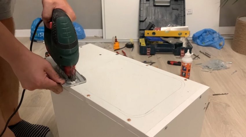 В верхней части выдвижной системы выпилите отверстие для ведра.