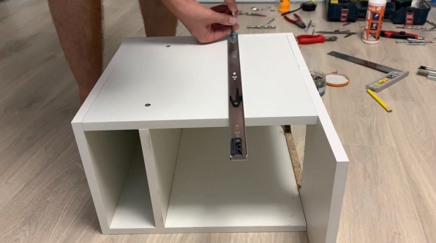 Закрепите направляющие, одна из которых будет располагаться сбоку, а другая снизу выдвижной системы.