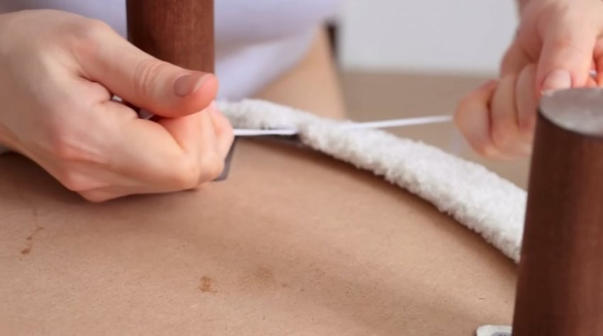 Соедините две детали чехла и сострочите их, чтобы получить цельный чехол. Обрежьте припуски на швы максимально близко к строчке, чтобы излишки ткани на чехле не топорщились. Зафиксируйте чехол на основании с помощью степлера.