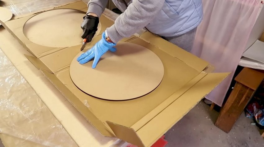 Для изготовления пуфиков потребуется большое количество картона, а также две круглые заготовки из МДФ диаметром 40 см. Оптимальная ширина деталей из МДФ — 6 мм. Использую детали из МДФ в качестве шаблона, вырежьте из плотного картона круглые заготовки так, чтобы высота стопки была примерно 30-35 см. Не страшно, если заготовки будут со сгибами, на прочность конструкции это не повлияет.