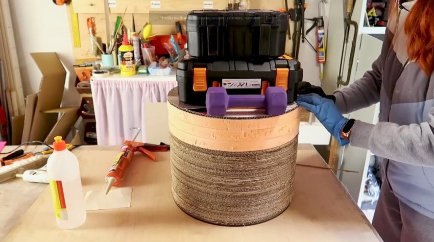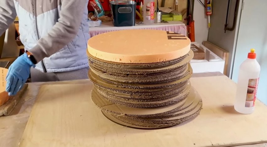 Сверху на пеноплекс приклейте еще одну заготовку из картона. Для верхнего слоя выбирайте самую плотную заготовку без перегибов. Последним шагом к нижней и верхней частям основания пуфика приклейте детали из МДФ. Положите на конструкцию груз и оставьте до полного высыхания клея.