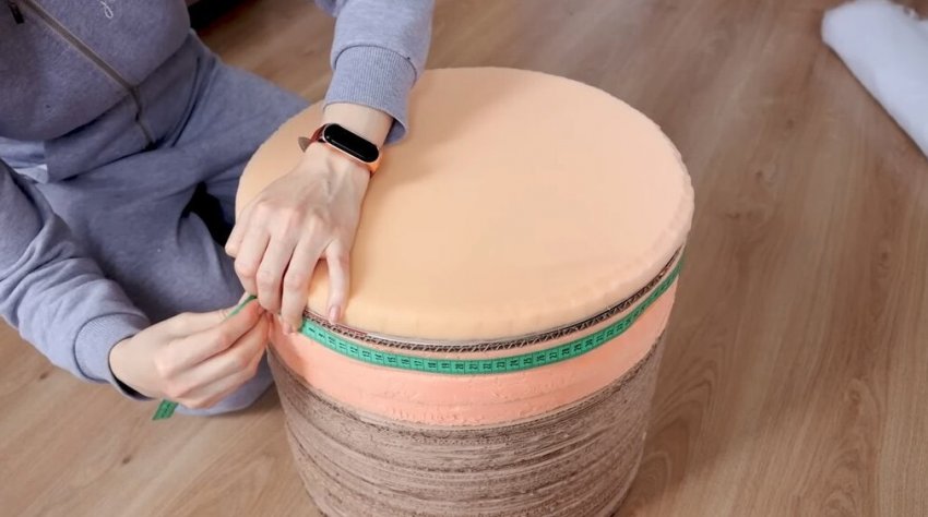 Для изготовления верхнего мягкого слоя используйте поролон. Для его фиксации подойдет горячий клей. Измерьте длину окружности основания пуфика и, ориентируясь на эти размеры, сшейте внутренний чехол из хлопчатобумажной ткани и синтепона.