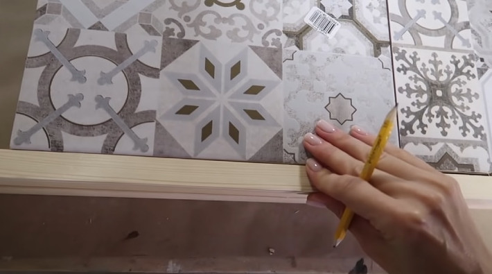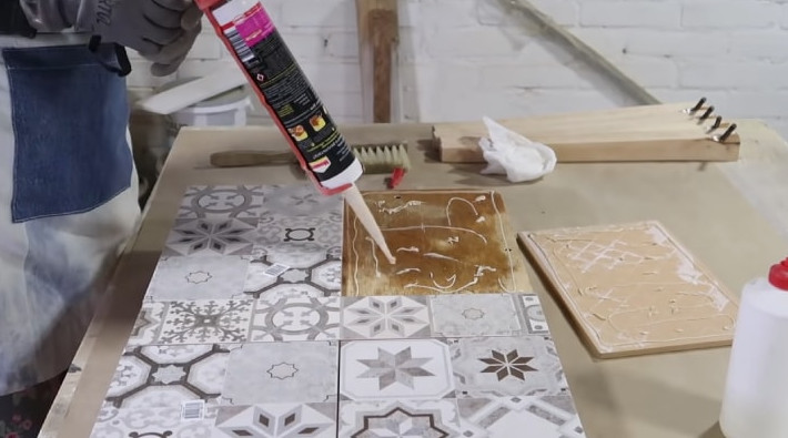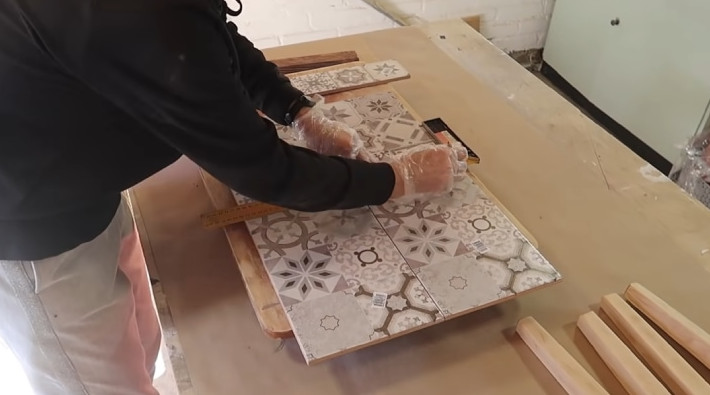 Обратную сторону стола и ножки покройте морилкой или краской, чтобы они сочетались с плиткой. Край обрамите брусками, которые также покройте той же морилкой или краской.