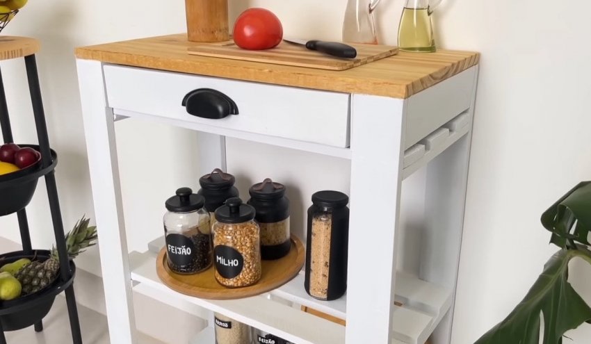 Последним шагом закрепите на выдвижном ящике ручку. Такой стеллаж станет прекрасным дополнением интерьера кухни или загородного домика.