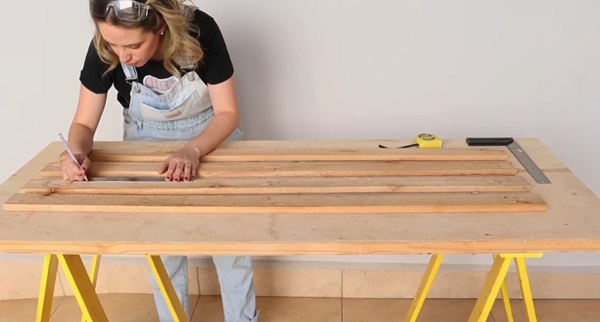 Разберите деревянный поддон на отдельные доски. Сделайте на досках разметку и распилите их на части. Для работы необходимо подготовить:
