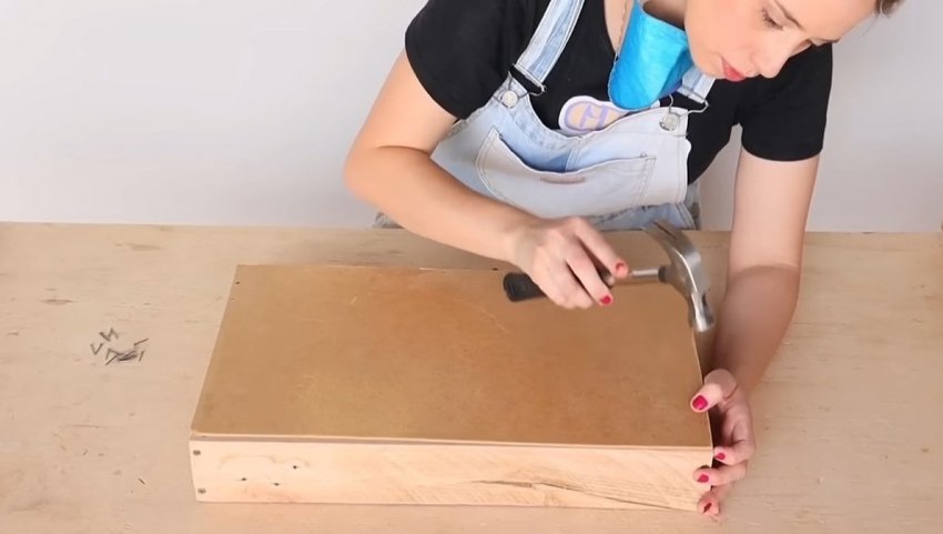 Переходим к сбору ящиков. Для этого соедините две рейки длиной по 45 см и две рейки длиной по 26 см. Вырежьте дно ящика из фанеры.