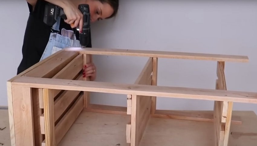 Прикрутите к столешницы боковые планки, которые будут прикрывать выдвижной ящик. Расположите выдвижной ящик на необходимом месте и закрепите его с помощью одной из трех одинаковых заготовок.