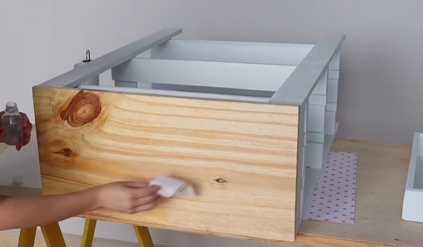 Для оформления столешницы используйте специальное масло для дерева. Для дополнительной защиты окрашенных поверхностей можно использовать воск.