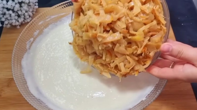 К обжаренным на растительном масле луку и моркови добавьте нашинкованную капусту. Тушите на среднем огне до готовности капусты. Добавьте соль и перец по вкусу и остудите капусту до комнатной температуры.