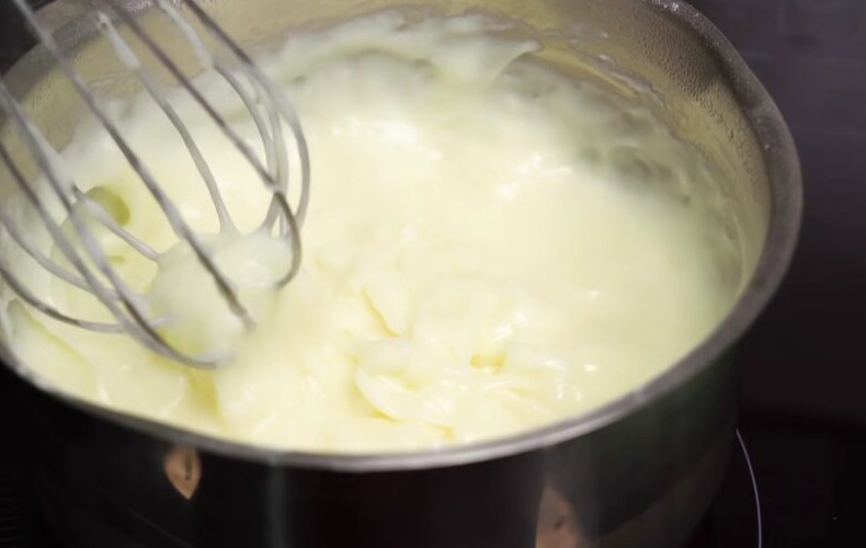 Пока тесто подходит, подготовим заварную основу для крема. Для этого в сотейнике соедините сахар, кукурузный крахмал и яйцо. Тщательно перемешайте ингредиенты. Добавьте молоко, поставьте сотейник на огонь и при постоянном помешивании заварите крем. После закипания проварите крем еще 30-40 секунд и снимите сотейник с огня. В готовый крем по желанию можно добавить ваниль.