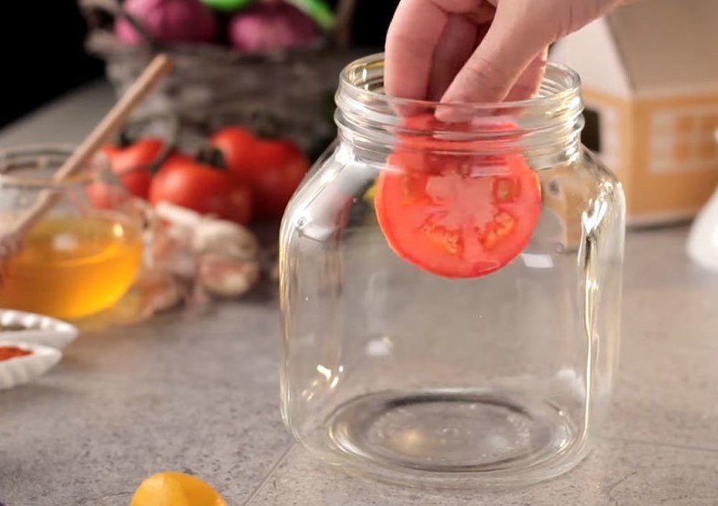 1. Помидоры нарезаем кружочками, укладываем в банку первым слоем.