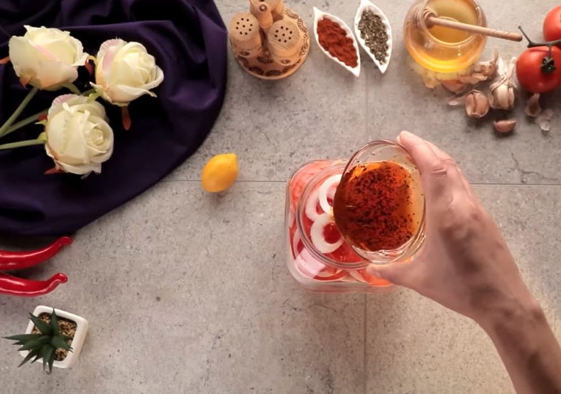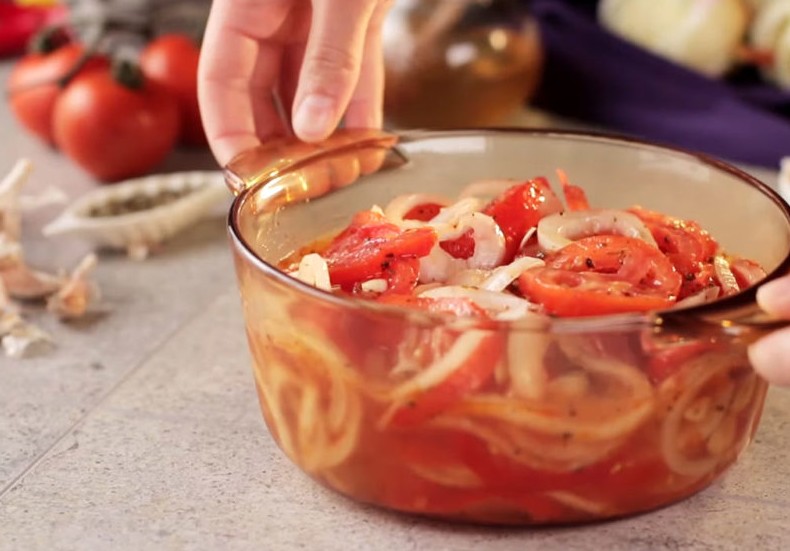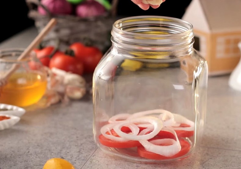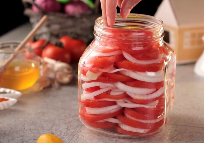 Вкусные и ароматные помидоры в банке станут вашей любимой летней закуской! Ингредиенты самые простые и доступные, ничего варить, кипятить или жарить не надо — только нарезать и сложить в банку нужные ингредиенты! На приготовление этой закуски вы потратите пару минут, а результат можно оценить уже на следующий день — маринованные, пряные, идеально сбалансированные по вкусовым качествам помидоры непременно покорят вас. Youtube | Appetitno.TV Youtube | Appetitno.TV Ингредиенты для помидоров в банке: 1 кг помидоров; 4 луковицы; 5 зубчиков чеснока; 7 ст. л. растительного масла; 4 ст. л. лимонного сока; 1 ч. л. сушеного базилика; 1 ч. л. острой паприки; 3 ст. л. меда; 1 ч. л. соли. Приступаем к приготовлению: 1. Помидоры нарезаем кружочками, укладываем в банку первым слоем. Youtube | Appetitno.TV 2. Лук также нарезаем кольцами, укладываем следующим слоем. Добавляем нарезанный чеснок. Youtube | Appetitno.TV 3. Продолжаем укладывать слоями помидоры, лук и чеснок. Youtube | Appetitno.TV 4. Последний слой в банке — это лук. Youtube | Appetitno.TV 5. Смешиваем мёд, растительное масло, лимонный сок, соль и специи. Youtube | Appetitno.TV 6. Заливаем полученной смесью помидоры в банке. Отправляем в холодильник на ночь. Youtube | Appetitno.TV Ароматная закуска из помидоров готова. Приятного аппетита! Youtube | Appetitno.TV Подробнее о том, как приготовить вкусные и ароматные помидоры в банке, смотрите в видео ниже: