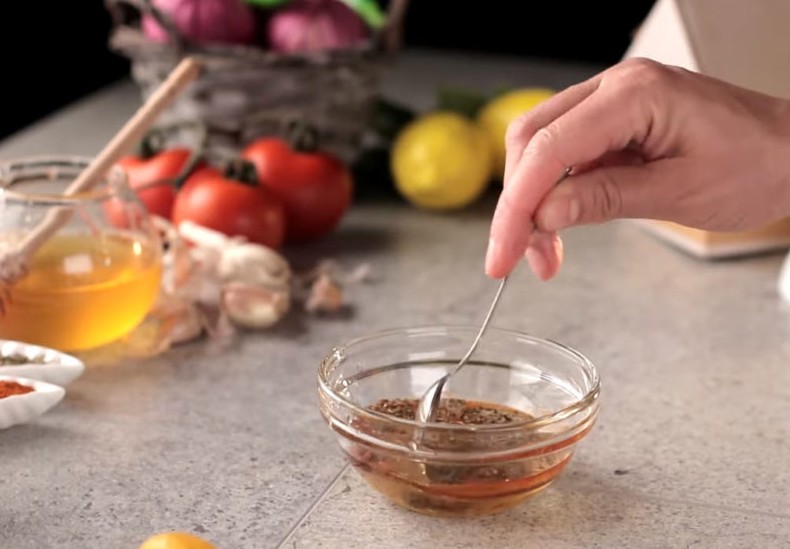 5. Смешиваем мёд, растительное масло, лимонный сок, соль и специи.