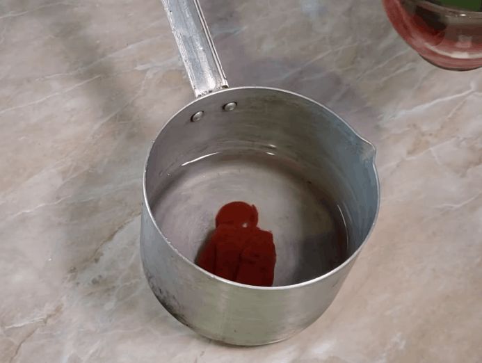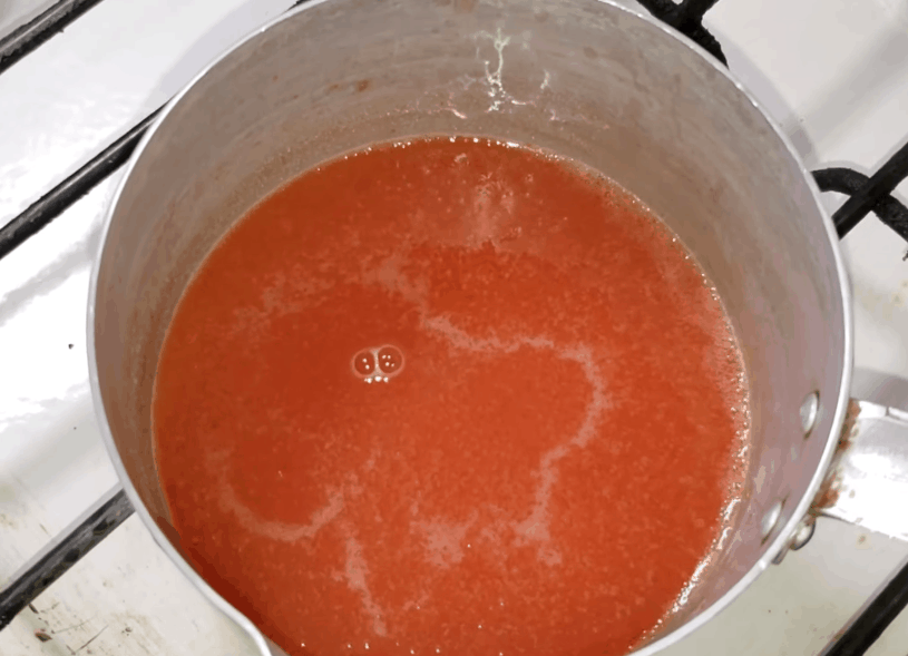 Выливаем в емкость жидкость, туда же добавляем томатную пасту, соль и агар-агар, хорошо перемешиваем и отправляем на огонь.