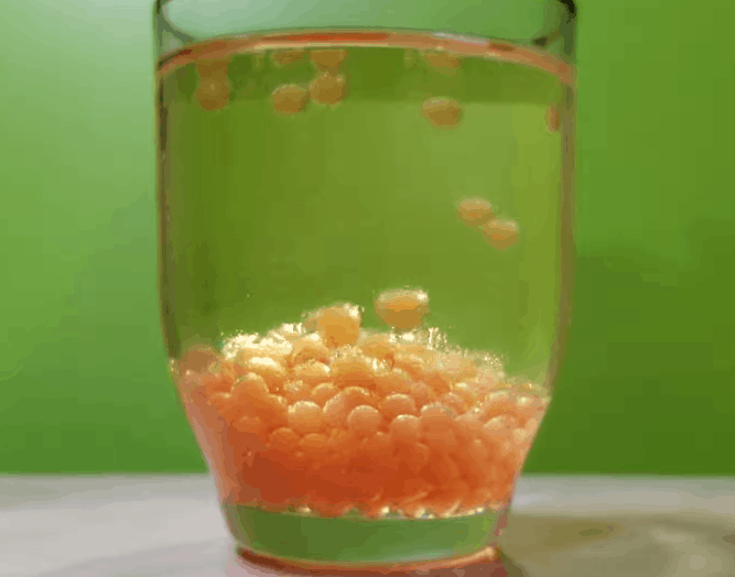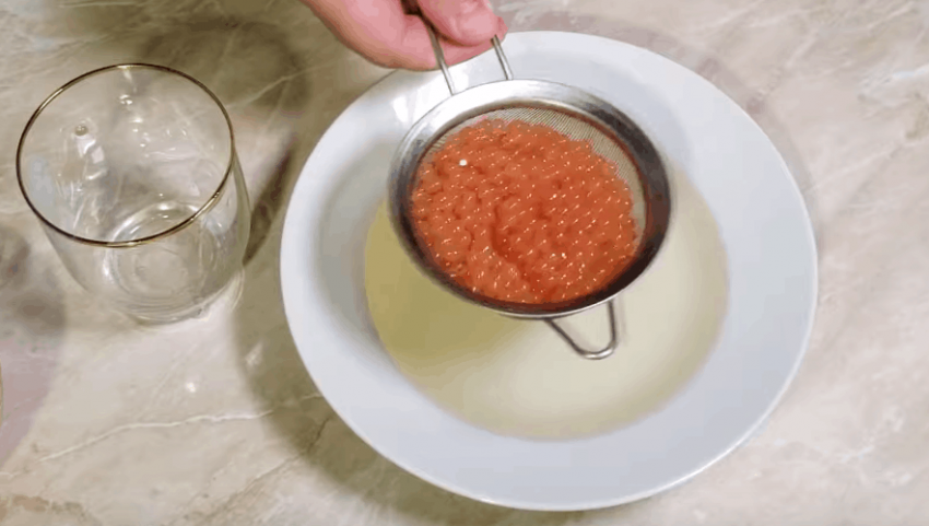 Масло не даст икринкам склеиваться. Каждая из них будет опускаться на дно по отдельности. Если икры планируется сделать много, лучше использовать 2 стакана, так как масло должно быть достаточно холодным. В случае, если основа для икры начнет сгущаться, жидкость нужно подогреть в микроволновке или на плите, а затем продолжить работу.