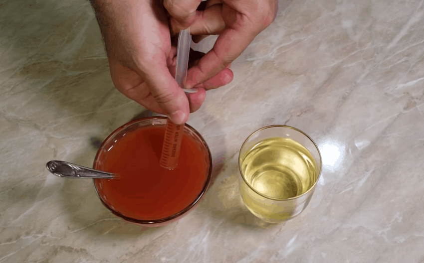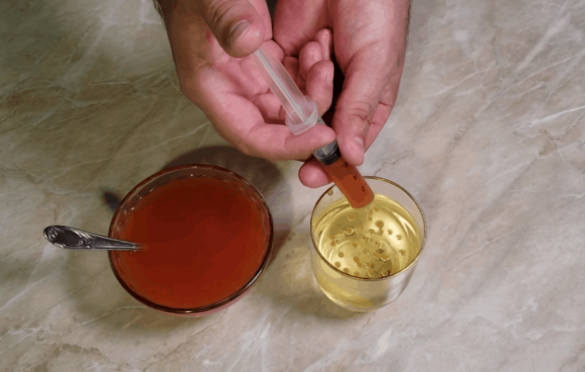 Дальше все предельно просто: держим шприц над стаканом и отправляем в него отдельные капли жидкости.