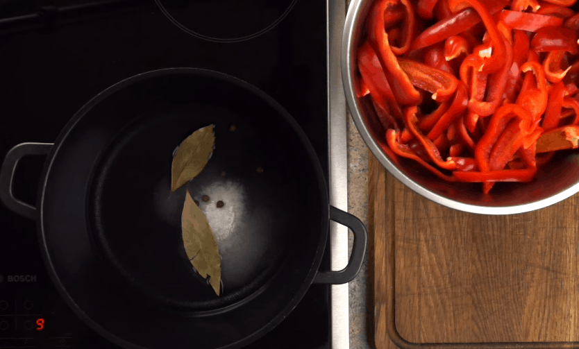 Подготавливаем маринад из воды, уксуса, соли, сахара с добавлением лаврового листа и душистого перца. Доводим его до кипения, убавляем огонь и отправляем туда нарезанный перец на 15 минут. Если жидкость не покрывает перец, делим его на несколько партий.