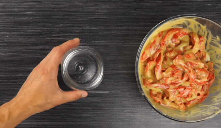 Достаем перец из маринада, даем ему немного остыть, а затем отправляем в горчично-масляную массу, хорошо перемешиваем и раскладываем в стерильные банки.