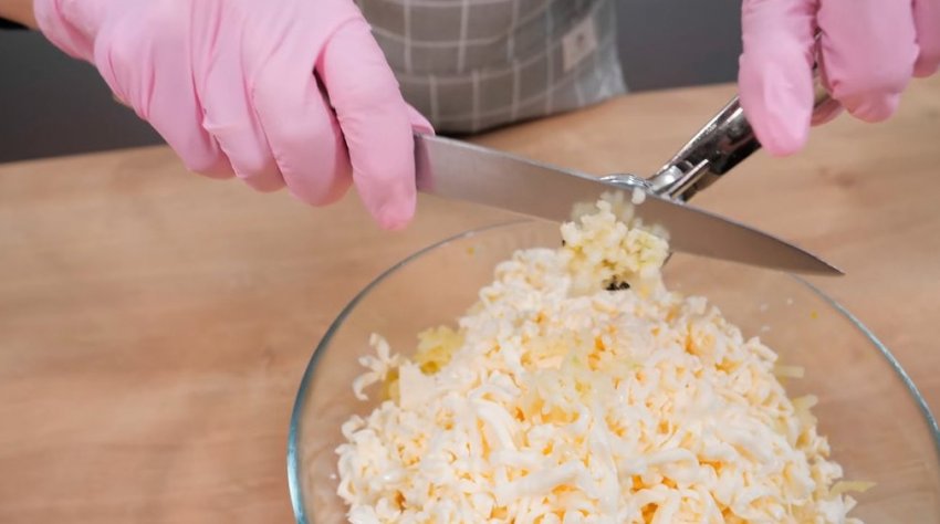 Добавьте к продуктам майонез, и хорошо перемешайте. Консистенция салата должна получиться довольно плотной, чтобы из массы было легко сформировать основу будущей елочки.