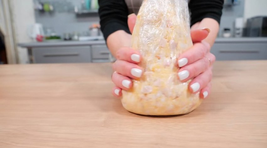 Для формовки салата понадобится пищевая пленка: выстелите на столе два отреза пленки внахлест друг на друга. Выложите салат на пленку, и приподняв все края пленки, придайте массе форму елочки. Аккуратно уберите пищевую пленку, и выложите салат на блюдо для подачи.