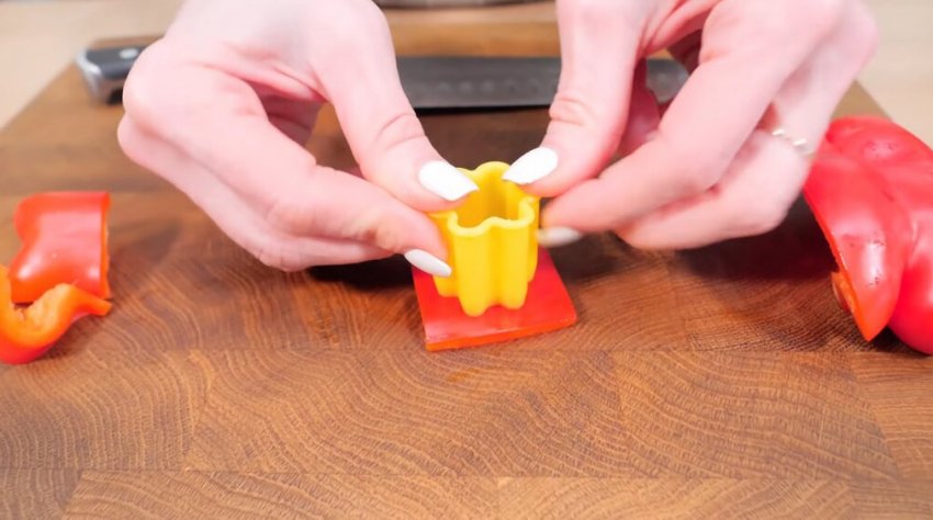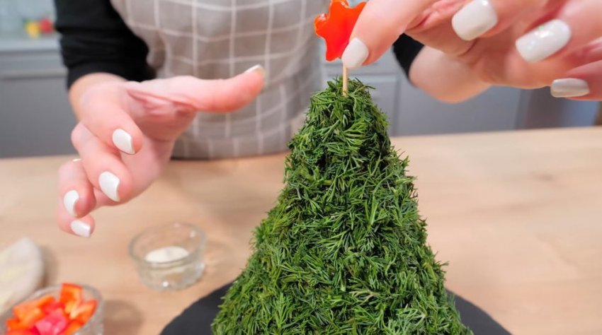 Для оформления елочки мелко нарежьте зелень укропа. Из красного болгарского перца вырежьте верхушку елочки.