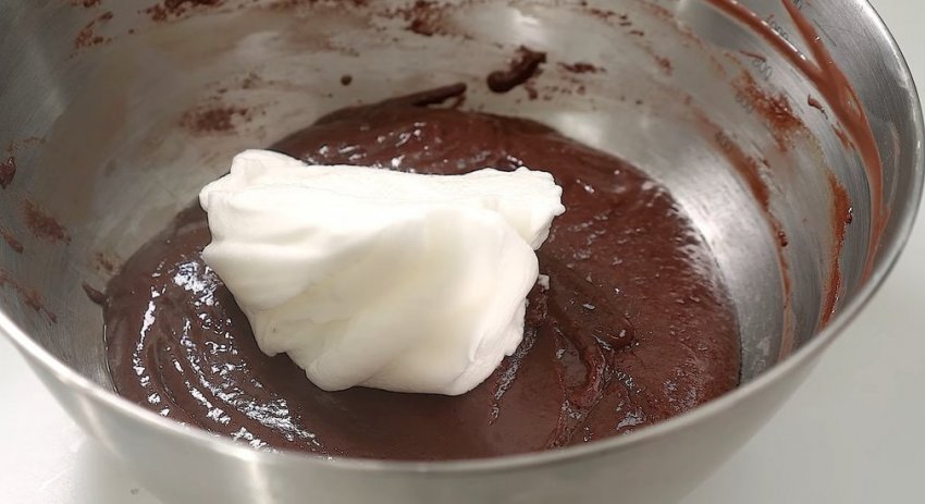 В растопленный на водяной бане шоколад добавьте яичные желтки и хорошо перемешайте. Взбитые до пышной белой массы белки по частям введите в шоколадную массу.
