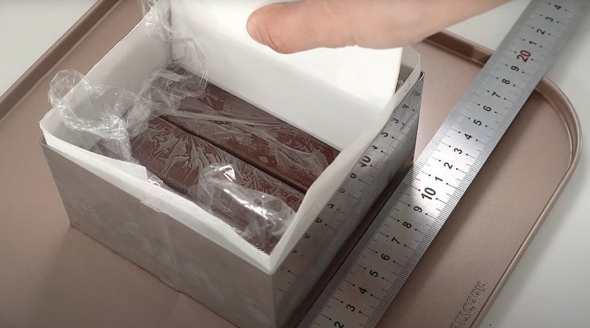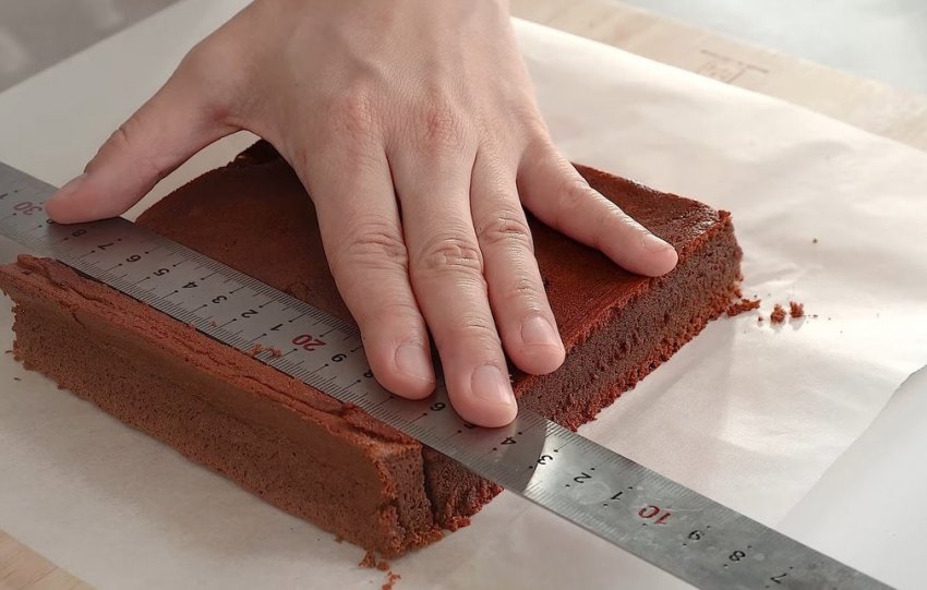 Выньте заготовку из формы и оставьте до полного остывания. Срежьте края и поместите заготовку в высокую форму меньшего размера, застеленную пергаментной бумагой.