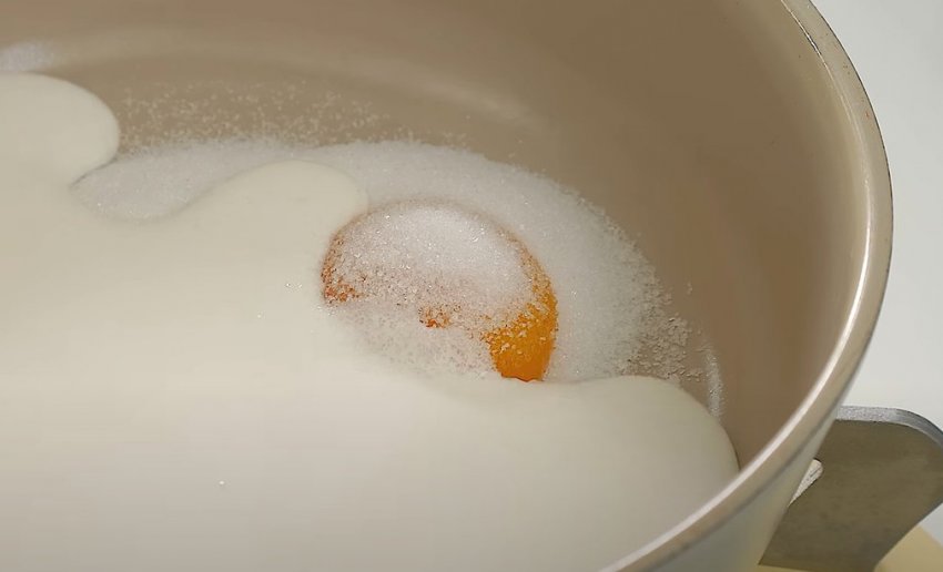 На слабом огне при постоянном помешивании нагрейте 1 яичный белок, сахар и жирные сливки. Сахар должен полностью раствориться.