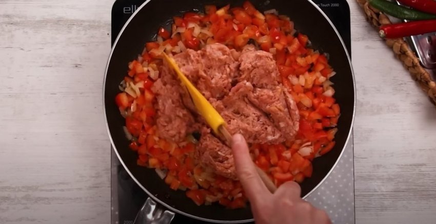 К мелко нарезанному луку добавьте перец и мясной фарш. Добавьте соль, перец, измельченную зелень петрушки и обжарьте продукты до готовности.