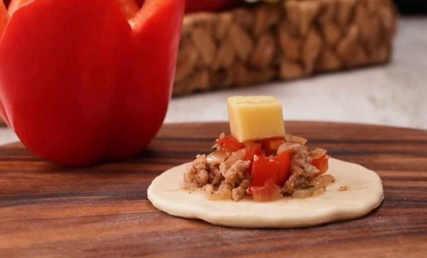 Выложите столовую ложку начинки на круглый кусочек слоеного теста. Сверху на начинку положите кусочек сыра. Диаметр кружочка теста должен быть немного больше диаметра перчины.