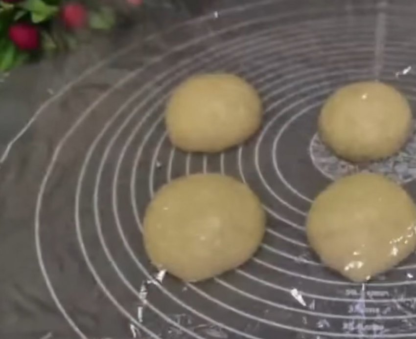 Разделите тесто на 6 равных частей и сформируйте из каждой шарик. Накройте заготовки пленкой и оставьте на 10 минут.