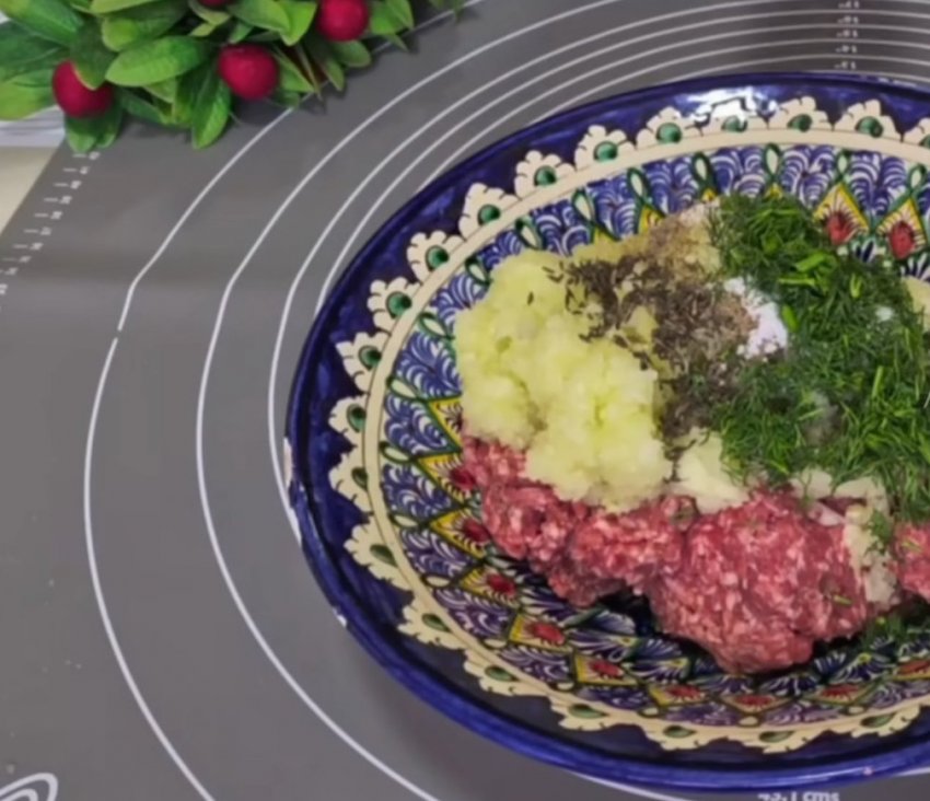Для приготовления начинки смешайте фарш с мелко нарезанным репчатым луком, специями и укропом.