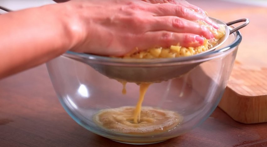 На крупной терке натрите сырой картофель. Отожмите картофель от сока.