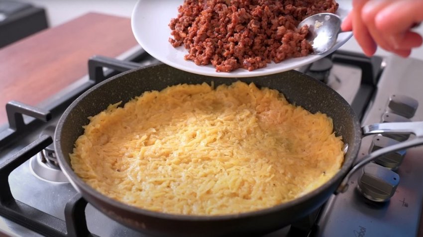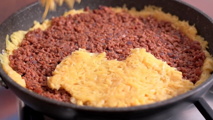 На раскаленной сковороде растопите кусочек сливочного масла. Выложите на сковороду половину картофельной массы. Равномерно распределите картофельную массу по сковороде и сформируйте небольшой бортик. Выложите на картофель мясную начинку.