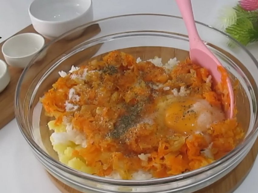 Мелко нарезанный лук и тертую морковь обжарьте на небольшом количестве растительного масла. Добавьте обжаренные овощи, яйцо и специи к картофелю и рису и хорошо перемешайте.