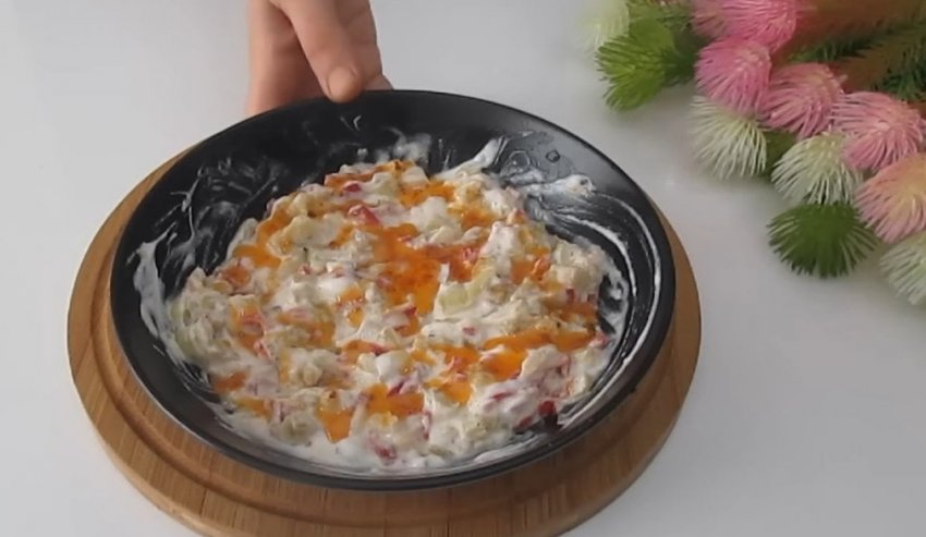 Блюдо можно подавать к столу с овощной закуской. Для ее приготовления запеките один баклажан и один болгарский перец, нарежьте их небольшими кусочками. Добавьте к овощам два зубчика чеснока и 2 столовых ложки натурального йогурта.